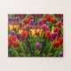This beautiful jigsaw puzzle features a high-definition image of tulips in various bright shades of red, purple and yellow.