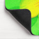 Painting of a bright yellow flower with green leaves, surrounded by neon green, is printed on mousepads.