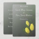 Three bright and elegant yellow wedding tulip flowers weddign invitation, with green leaves and graduated green and purple background
