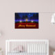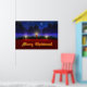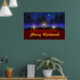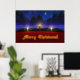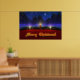 A 3D Christmas scene created in Vue, with candles set on red in front of pine garland accented with red and gold ornaments. In the snowy background are blue-green fir trees against a swirling fractal sky sprinkled with stars. A single sparkling star dominates the night sky. In front of the holiday decorations is a glowing gold Merry Christmas greeting.