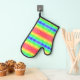 Brightly coloured oven mitt with a rainbow and diamond pattern on the front, black trim. Back is plain black with textured grip, loop for hanging.