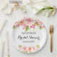 A rustic style paper plate for a bridal shower. With contemporary pink, peach and coral coloured watercolored dahlia flowers. A chic white background. The name is written with white coloured hand lettered style script.