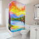 Brilliant coloured drawing of sunset over lake. Bold colours with mountains, lake and forest.