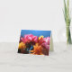 This thank you card features a dramatic bouquet of dahlias in brilliant colours of deep red, orange, pink, yellow and gold against a pure blue sky. More dahlias are scattered inside. The text reads: Thank You! It can be customized to suit your needs.