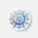 A detailed snowflake with a vibrant blend of blue and pink hues stands out against a white background. The intricate patterns are highlighted, giving it an illuminated and almost three-dimensional appearance.
