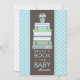 An adorable little owl is perched atop a stack of books in shades of blue and green on this cute invitation for a bring-a-book baby shower. Text on the back has sample text for asking guests to also bring their favourite children's story to start the Mom-to-be on creating baby's library. In trendy brown and baby blue with polka dot pattern background, this lovely design is sure to please any new mommy. Also available are bookplate stickers to include in the invitation for each guests to sign and label their book gifts.