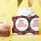 This cute design has a red and black chequered background with a layered pattern. The pattern is made up of a white circle, with red car. On top of the car there is a Christmas tree. The text inside the circles reads, "Bringing Home The Christmas Tree".