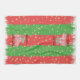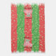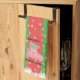 This festive kitchen towel features a red car with an evergreen tree, over a red and green striped background. The text reads, "Bringing Home the Christmas Tree” and it can be customized .