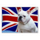 Shown is a photographic image of a white English bulldog in front of a British flag.