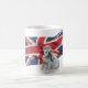 Shown is a photographic image of a white English bulldog wearing a deerstalker cap and with a calabash pipe (inspired by Shirlock Holmes) in front of a British flag.