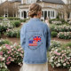 Women's denim jacket is great for Brits who are now US citizens. Image shows both USA and UK flags and reads, "British by birth American by choice". Great to show respect and love for both your birthplace and your new home in the United States of America. Wonderful gift for her, too, especially for new citizens.