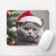 Cute blue/grey British shorthair cat wearing a Santa hat.