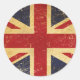 Round sticker with the British flag in vintage distressed grunge old style design. This scratched design features The Union Jack flag in retro vintage style. This United Kingdom flag design is a great way to show you are proud to be British.