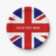 British Union Jack paper party plates. English pride design. Flag of UK United Kingdom, GB Great Britain. Custom throw away / disposable party supplies with UnionJack. Add your own name, monogram, funny quote or saying. Fun for international royal wedding, Birthday or national holiday events.