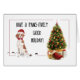A handsome brittany dog breed is sitting alongside a decorated Christmas tree. Packages are awaiting opening! The dog is wearing a santa hat with a red bow tie. Funny card to send this holiday season!