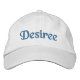 Nom modifiable sur un casquette de baseball brodé / casquette de base-ball personnalisé. Vous avez le choix entre les couleurs casquettes, le style, le style de texte et la couleur de broderie. (Utilisez l'outil de conception pour modifier la couleur, la taille ou le style du texte.) Le nom personnalisable, Desiree, est illustré par une broderie bleue sur un casquette de baseball blanc. Conception par 369MyName.
