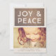 Gorgeous faux bronze glitter with white simple yet chic Joy & Peace typography lettering on the front of this designer soft neutral modern greeting flip open card which you can upload with your own new baby, family or child photo portraits.
