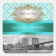 Customizable Invitations and accessories with a black and white East River skyline view of New York City's iconic Brooklyn Bridge and Municipal Building with a boat passing by. They also feature a Turquoise Blue (aka Robins Egg Blue) & white damask pattern, a teal ribbon and a white label in your choice of a silver or gold look frame. (Note: some coordinating accessories may not have the above mentioned photo or additional design elements.)