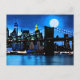 Postcard in an impressionist, digital painting of the Brooklyn Bridge, and the city beyond, under a full moon, with moonlight reflected on the water
