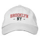 Preppy BROOKLYN NY Red and Black embroidered on White cotton hat. Embroidery colours are customizable to other colour choices by selecting the "Edit Design" tool button. Also available is the option to select choice of hat colour on the main item page.