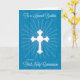 On the front of this blue card is a cross that is surrounded by rays. This would be a great card to give to a special brother of yours once he goes through his very first Holy Communion. Congratulate him with this card.