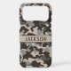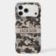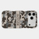 Customize this brown and gray camouflage iPhone 17 pro max case with your name in a trendy modern CAP font in brown on taupe. It's masculine and perfect for your favorite military, hunting, country or outdoorsman!