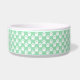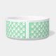 This pet bowl features a pattern of white dog paw prints on a mint green background colour. There is also a brown banner with a customizable text area for the name of your pet. The beige colour can be changed to any other colour under customization.