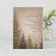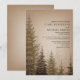 Faire-part de mariage rustique avec une illustration au fond d'arbres à feuillage persistant sur un arrière - plan brun.