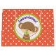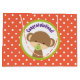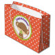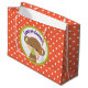 A gift bag, large sized which says congratulations! With a cute baby monkey with a pacifier in his mouth Inside an olive green circle. The background is an orange and white polka dot pattern.
