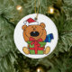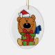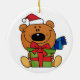 An adorable brown bear wearing a red stocking cap holds a big Christmas gift with a red bow on a holiday ornament that's sure to make the recipient smile!