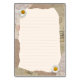 Beautiful vintage notes page in beige and brown colours, decorated with daisy blossoms and postage stamps in the background. Fill the lines with your own notes or any other text.