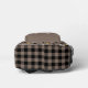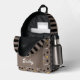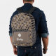 Brown backpack perfect for your dog's treats and toys and blankets with a brown and black pattern of bones and yellow balls and paw prints with stripes and a brown buffalo check, personalized with your dog's name beneath a paw print. Brown paw print backpack personalized with name in a white script with a mix of patterns like stripes, brown buffalo check, and bones and balls and paw prints.