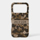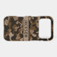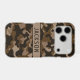 Customize this multi-hued brown camouflage iPhone 17 pro case with your name in a trendy modern CAP font in dark brown on light brown. It's masculine and perfect for your favorite military, hunting, country or outdoorsman!