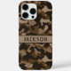 Customize this multi-hued brown camouflage iPhone 16 pro max case with your name in a trendy modern CAP font in dark brown on light brown. It's masculine and perfect for your favorite military, hunting, country or outdoorsman!