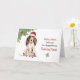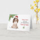 This card enables you to send funny Christmas greetings to anyone with the help of the adorable brown cocker spaniel dog that sits on the cover of this card noticeable wearing a red Santa hat and spreading lots of paw prints too.