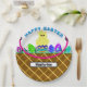 Whimisical brown Easter basket with pink and green Easter grass and pink basket handle. Happy Easter typography in sky blue. Cute yellow chick hatched from colourful striped egg . Decorated eggs. Hippity hop typography in black inside black and white rectangle. Original Artwork Design © TamiraZDesigns.