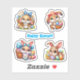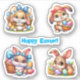 Four cute brown and white Easter bunnies with colourful eggs. In the centre is a fun blue Happy Easter message. Stickers are available in many sizes.