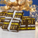This wrapping paper design features a message like "FIRST-NAME’S 91st BIRTHDAY!", with the "91st" having a faux/imitation gold-like colour appearance, and with the name and "BIRTHDAY" in a fun, bold font. The name can be customized, and the background is coloured brown. Wrapping paper like this could perhaps be used when wrapping birthday gifts being given to somebody in celebration of their ninety first birthday. [~Z0000211]
