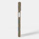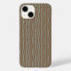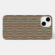 This phone case has a geometric design of sort of flat-ended ovals repeating across the design in pale blue on a field of brown.