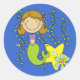 A brown haired smiling mermaid and yellow starfish swim among the seaweed, a design that's cute and colourful for girls who love the ocean and mermaids! Mermaid T-shirts, bodysuits, bibs, blankets, burp cloths, cards, stickers, bags, mugs, key chains, pillows, wall clocks, and lots of other mermaid gear!