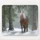 Mouse pad with a photograph of a brown horse with a long white scruffy mane. Standing in a forest with snowflakes falling all around.
