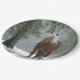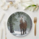 Paper plates with a photograph of a brown horse with a long white scruffy mane. Standing in a forest with snowflakes falling all around.