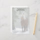 Stationery paper with a photograph of a brown horse with a long white scruffy mane. Standing in a forest with snowflakes falling all around.