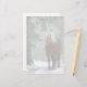 Stationery paper with a photograph of a brown horse with a long white scruffy mane. Standing in a forest with snowflakes falling all around.