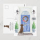 Announce your new address with our stylish announcement featuring a Brown Labrador retriever, blue front door, welcome mat, slate sign, topiaries and a floral wreath set on a grey brick background.