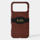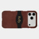 Red-brown leather texture is the background on this iPhone case. A black band and badge holds your name or monogram. Elegant, country, and very stylish!