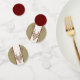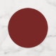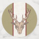 This table confetti has large circles with a brown male deer head with large antlers on a striped background of dark red, white, and tan. The medium circles are dark red and the small circles are white.