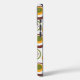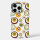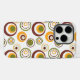 This phone case has a mid-century modern design of concentric circles in gold, green, and brown on a white background.