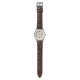 This men's watch has a mid-century modern design of concentric circles in gold, green, and brown on a white background.