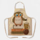 Bold brown owl standing on a little stack of books holding a white chalk all over print apron . Thoughtful gift for preschool or elementary school teachers .